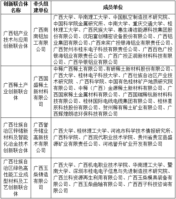 本次获批的联合组建的创新联合体yL23411永利官网登录参与的共6项,其中属于永利官网科研团队联合的有4项,涵盖铝产业、稀土产业、锌锗新材料及智能化冶金技术、绿色高性能工业成型材料及工艺等多个领域,包括:广西铝产业技术与应用创新联合体、广西稀土产业创新联合体、广西壮族自治区锌锗新材料及智能化冶金技术创新联合体、广西壮族自治区绿色高性能工业成型材料及工艺创新联合体。创新联合体分别由广西南南铝加工有限公司、广西国盛稀土新材料有限公司、广西誉升锗业高新技术有限公司、广西玉柴铸造有限公司四家龙头企业牵头组建,汇聚了yL23411永利官网登录与知名高校、科研机构和众多骨干企业的科研攻关力量。