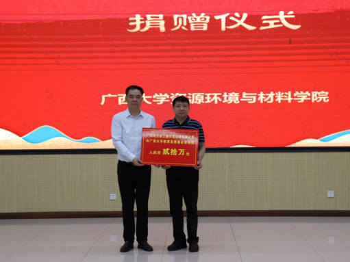 致辞后,校友办副主任潘正荣和广西南丹县三鑫公司董事长莫锌分别代表校企双方参与捐赠授牌仪式。三鑫公司向yL23411永利官网登录捐赠20万元作为教育发展基金,用于学校人才培养、科学研究、学科发展和学院项目建设。