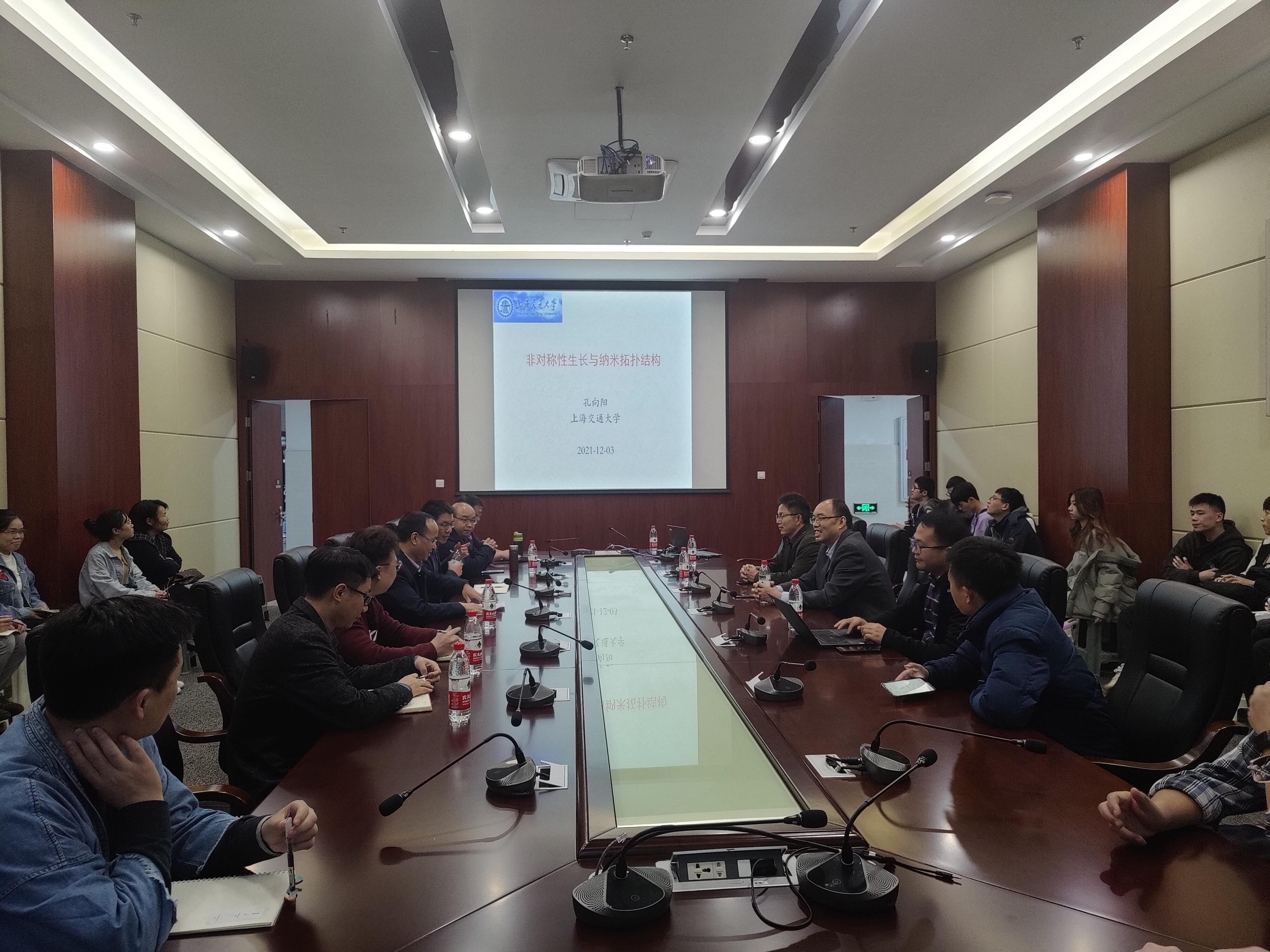 2021年12月3日下午,上海交通大学材料学院孔向阳教授到永利官网进行学术交流,并作了题为《非对称性生长与纳米拓扑结构》的学术报告,报告沈大强书记主持,材料学系、材料物理化学系、材料加工工程系的师生参与了此次活动。